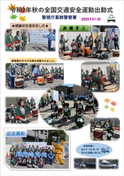 葛飾警察署で行われました「令和6年秋の交通安全運動」の出動式で、本田町会太鼓部へ演奏の依頼がありましたので、その模様を是非ご覧ください。