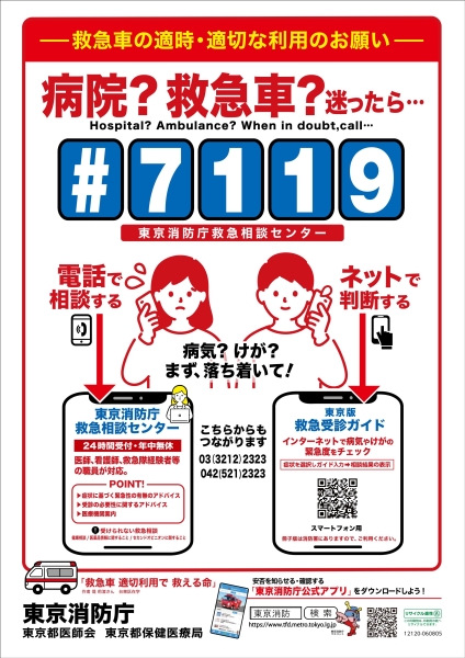 ①「表紙~4ページ」 2.63MB現在、救急車の要請が非常に多く、近くの救急車が出場している場合、遠くにいる救急車が出動することになり、到着までに時間がかかることがあります。